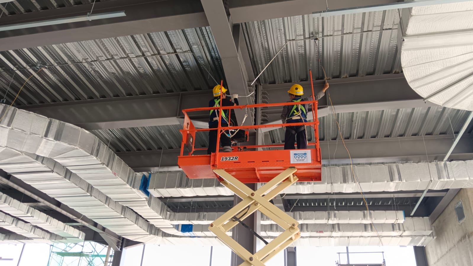 Dokumentasi pelaksanaan pekerjaan instalasi sistem MEP pada bangunan, meliputi penarikan dan penataan jalur kelistrikan, pemasangan ducting HVAC, serta pekerjaan pendukung mekanikal di area ceiling. Proses pekerjaan dilakukan menggunakan peralatan kerja di ketinggian (scissor lift) dengan penerapan standar Keselamatan dan Kesehatan Kerja (K3) untuk menjamin kualitas instalasi, keamanan personel, dan kesesuaian dengan spesifikasi teknis serta gambar kerja.