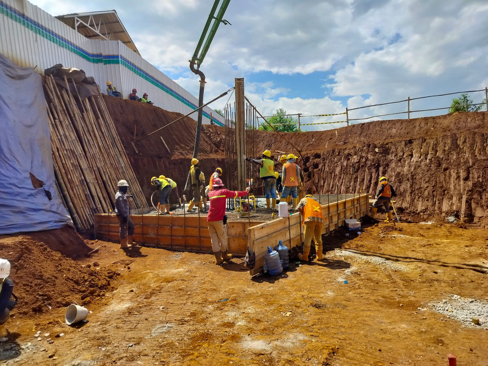 Dokumentasi pelaksanaan pekerjaan pondasi tower transmisi, meliputi pekerjaan galian tanah, pemasangan bekisting, penulangan (rebar), serta proses pengecoran beton menggunakan concrete pump. Seluruh tahapan pekerjaan dilaksanakan sesuai gambar kerja, metode pelaksanaan (method statement), dan standar Keselamatan dan Kesehatan Kerja (K3) guna menjamin kekuatan struktur pondasi, stabilitas tower, serta keandalan sistem transmisi listrik.